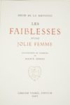 RESTIF DE LA BRETONNE (Nicolas). Les Faiblesses d’une jolie femme. Paris, Edmond Vairel, Éditeur, s. d. [1951]. Grand in-8° en feuilles, sous couverture, chemise et étui de l’éditeur.26 bois en couleurs par Raoul SERRES.Tiré à 1 025 exemplaires, celui-ci (n° 61), un des 75 sur vélin de Rives comprenant deux suites supplémentaires des illustrations, dont une en couleurs.