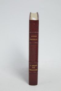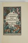 SALMON (André). L'Amant des Amazones. A Paris, Éditions de La Banderole, s. d. [1921]. Petit in-8°, maroquin lie-de-vin janséniste, dos à nerfs, filets à l’intérieur, gardes de moire grise, tranches dorées, couverture rose conservée, étui (Gruel).Bois en couleurs par Jean-Gabriel DARAGNÈS.Tiré à 1 076 exemplaires, celui-ci (n° 12), UN DES 25 DE TÊTE SUR JAPON IMPÉRIAL contenant une suite supplémentaire des illustrations.Dos légèrement passé.