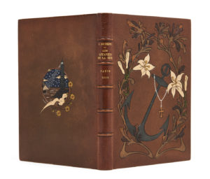 encadrant une grande ancre mosaïquée en maroquin vert gris sur laquelle pend une petite croix en maroquin ocre au bout d'une chaîne de maillons au palladium, sur le second plat, composition centrale mosaïquée en maroquin dans les mêmes teintes, entourée dans un cercle serti d'un listel de maroquin ocre, figurant un phare éclairant un voilier dans une nuit étoilée, un albatros et des fleurs, dos à nerfs, auteur, titre, lieu d'édition et date dorés, large encadrement intérieur de maroquin brun orné d'un décor floral mosaïqué, avec une lyre et une ancre aux angles inférieurs, composé de filets à froid et de pièces de maroquin crème, rouge, ocre et vert, doublures et gardes de soie verte au décor floral, tranches dorées, couvertures et dos conservés (P. Ruban - 1908).