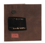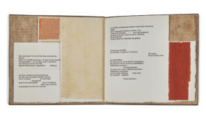 ocre-rose avec le titre à froid incrustée, perle plate de bois brun et petit filet à l'œser orange en bord du plat, sur le plat inférieur, petite pièce de veau brun avec léger ponçage et 3 filets à l'œser orange en bordure du plat, doublures et gardes de papier népalais, étui-boîte en papier népalais rigidifié par deux baguettes de bois (M[onique] M[athieu - 2002 - C. Ribal - M. Mélin]).