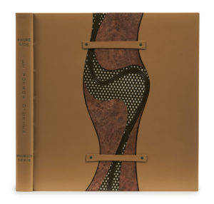 de box vert kaki sur fond de même box kaki poncé de petits points apparaissant blanc cassé, deux petites lanières de box sable rivetées de petits cercles de box vert sous-bois semblent retenir les deux parties en box de la reliure, plat inférieur à incision sinuant de la tête à la queue peinte en noir, plats traversés verticalement par l'incrustation d'une forme irrégulière en loupe de thuya, lacets de box vert olive, dos lisse avec auteur, titre et artiste à l'œser vert sous-bois, tranches dorées, doublures et gardes de peau velours beige, couvertures et dos conservés, chemise et étui (Renaud Vernier - 1988 - E.D. Fié). — [4] ff., 105 p., [2] ff.