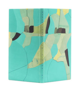 dans les teintes vert d'eau, veau moutarde, turquoise et acajou, incrustées à niveau, en creux ou en léger relief dos lisse avec titre en long à l'œser violet, doublures bord à bord de veau gris, couvertures marbrées conservées, chemise et étui (M[onique] M[athieu]). — 1 f. bl., 34 p., [3] ff., 1 f. bl.