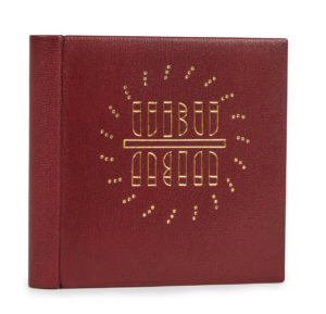 constitué de filets dorés, entouré d'un jeu de petits points dorés imitant les rayons du soleil, titre constitué de filets dorés au plat inférieur, dos lisse muet, doublures et gardes de peau velours grenat, couvertures et dos conservés, chemise et étui (M. Richard - 2010). — 152 p., [5] ff.