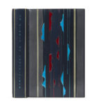 gris-vert verni, complété par des formes bombées en veau verni brillant turquoise et grenat s'appuyant sur des filets verticaux à l'œser brillant rouge et turquoise, dos lisse orné d'une grande pièce verticale de veau bleu marine bordée de deux listels de veau gris-vert verni, titre à la chinoise à l'œser turquoise brillant, tranches dorées, listel intérieur de box gris perle, doublures et gardes de peau velours bleu pastel, couvertures et dos conservés, chemise et étui (C. et J.-P. Miguet - 1989).