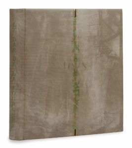 est irrégulièrement teintée de petites touches imprimées vert amande et orangé, deux incisions en tête et en pied aux extrémités de cette bande, semé irrégulier de petites pièces de box gris clair, dos lisse avec titre à la chinoise en box vert amande, doublures bord à bord de box gris clair relevé au centre de petites formes évidées relevées de projections de peinture blanche, incisions relevées de touches vert amande et orangé, gardes de peau velours gris-beige, couvertures et dos conservés, coffret (Sánchez-Álamo - janvier - 05) — [3] ff., 205 p., [1] f.