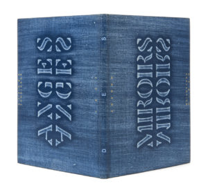 sur les plats, au premier plat noms des auteurs à l'œser jaune, au second plat nom de l'artiste et date, dos lisse avec le " des " du titre à l'œser bleu ciel, tête rognée, doublures bord à bord de box bleu outremer, gardes de peau velours bouton d'or, couvertures et dos conservés, chemise et étui (F. Brindeau - 2003). — [9] ff.
