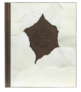 superposant et imitant les pétales d'une fleur, au premier plat, large losange en réserve avec bordure à entrelacs à froid portant le titre au palladium, dos muet, tête rognée, au second plat losange central resté en réserve, encadrement intérieur de box chocolat, doublures et gardes de peau velours gris perle, couvertures et dos, coffret (N. Kiyomiya - 2009). — 59 p., [2] ff dont 1 bl.