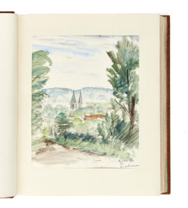 L'exemplaire est par ailleurs enrichi de 10 aquarelles originales signées, 5 dessins originaux de recherche avec la typographie, dont 2 en couleurs, avec les commentaires de Jean Frélaut et de 3 suites des eaux-fortes (27 figures sur papier vergé vert d'eau, justifiées 1/3 et signées, 26 figures sur papier pelure du Japon, justifiées 1/2 et signées, 26 épreuves des cuivres rayés sur papier vélin) reliées en un volume séparé, demi-maroquin feu à bandes de Madeleine Gras.