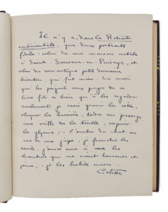 - d'un long envoi, au faux-titre, de Colette : " à Monsieur Marcel Galland, en souvenir d'un pays qui fut le mien, - avec le regret et l'amour d'une maison qui fut la mienne, - avec le plaisir aussi d'y avoir rencontré un bibliophile qui est l'ami du crapaud, de l'arbre et de la fleur. Colette ".