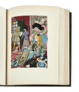 plus ou moins épais à l'or et au palladium, petits filets courbes dorés, filets au palladium se croisant et se prolongeant sur le dos lisse avec rappel du décor, auteur, titre, illustrateur et date dorés, encadrement intérieur d'un filet doré, doublures et gardes de soie imprimée, encadrées par un listel de veau rouge, tranches dorées, couvertures et dos conservés, chemise et étui (Devauchelle).