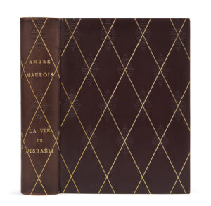 [HUARD].- MAUROIS (André) — La Vie de Disraëli. — Paris, Javal et Bourdeaux, 1928. — In-4 (29,8 x 21, 5 cm), box chocolat, sur les plats décor de losanges à froid traversés de filets dorés formant eux-mêmes des losanges, dos lisse avec...
