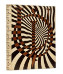 traversées de larges bandes de maroquin brun se rétrécissant vers le centre, dos lisse avec titre et artiste à l'œser rouille et brun orné de pastilles de maroquin brun, tête dorée, doublures bord à bord de box chocolat, gardes de box saumon, couvertures conservées, couverture en rhodoïd (J[ean] Kn[oll] - 1961). — 116 p., [2] ff.