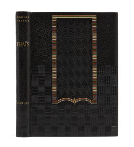 [JOU].- FRANCE (Anatole) — Thaïs. — [Paris], Les Cent bibliophiles, 1924. — In-4 (28,7 x 18,7 cm), maroquin noir, sur la moitié inférieure des plats décor à froid alternant de bandes horizontales avec de petits rectangles verticaux, au...