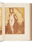 centre des plats, légèrement décalé vers le haut, grand encadrement de barrettes et listels de maroquin grenat, bleu nuit, vert pomme et crème mosaïqués à l'intérieur duquel est poussé un ensemble de losanges à froid, dos lisse avec auteur, titre et artiste dorés et rappel du décor des plats en queue, tranches dorées, doublures bord à bord et gardes de box abricot, couvertures et dos conservés, chemise et étui (Paul Bonet - 1941). — [4] ff., 214 p., [7] ff.