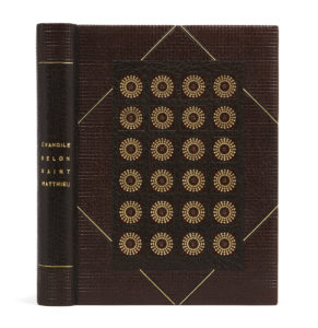 [JOU].- LEMAISTRE DE SACY — Évangile de N. S. Jésus-Christ selon Saint Matthieu. — Paris, Louis Jou, 1928. — In-8 (26,4 x 19,5 cm), maroquin chocolat, sur les plats large encadrement de maroquin brun à damier fait de filets à froid, au...