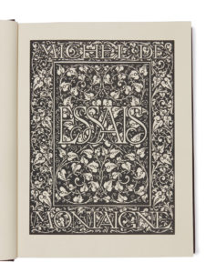 [JOU].- MONTAIGNE (Michel de) — Essais. — Paris, Louis Jou, 1934. — 3 vol. in-4 (32,3 x 24,7 cm), maroquin marron, sur les plats vaste décor de fleurons à froid inspiré des ornements de Louis Jou, rehaussé de cercles et points à l'œser...