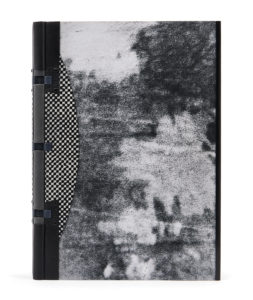 petites pièces de box noir à petits carrés avec rivets d'ébène en bordure du dos, large pièce gaufrée à damiers en box noir et blanc placée le long du dos, dos lisse muet gris souris et noir laissant apparaître la couture sur trois lanières de box gris-bleu, tête rognée, encadrement intérieur de box noir, doublures de peau velours vert bouteille, couvertures conservées, coffret (J. de Gonet - 1988). — 1 f. bl., [27] ff, 1 f. bl., [1] f., 2 ff. bl.