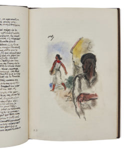 Exemplaire unique, ENTIÈREMENT CALLIGRAPHIÉ ET ORNÉ DE 14 FIGURES, DONT LA COUVERTURE, PAR LE PEINTRE LAURO, PRINCIPALEMENT AUX PASTELS, AVEC DES REHAUTS D'AQUARELLE.