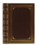 fleurons dorés, dos à nerfs orné de filets dorés, doublure de maroquin parme ornées d'un encadrement de 10 filets dorés, les 2 filets intérieurs entourant un dessin original signé sur chaque doublure, gardes de soie moirée chocolat, tranches dorées, couvertures et dos conservés, chemise et étui (Canape, R. D. - 1909). — [4] ff., 338 p., [3] ff.