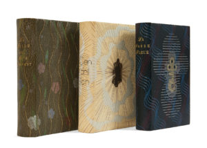 petits traits à l'œser rose, vieux-rose, rouge, bleu ciel et ivoire dessinant les fleurs, courant d'un plat à l'autre, l'ensemble traversé de filets dorés ondulant verticalement et de de hachures à froid, dos lisse avec titre doré, tranches dorées, encadrement intérieur de maroquin bleu nuit, doublures et gardes de peau velours vert amande, couvertures conservées, chemise et étui (ACFM). — 41 p, [3] ff.