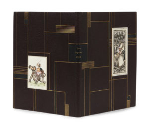 des plats, d'une plaque d'ivoire gravée et peinte représentant des scènes orientales (un couple sous un arbre et un éléphant), dos lisse orné d'une pièce de titre de maroquin noir chevauchant chacun des plats, doublures et gardes de peau velours verte, tranches dorées, couvertures et dos conservés, chemise et étui (Gauduchon-Blin - 1995).