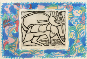 Le Chien roi, 1983. — Plate from the series Le Chien Roi. — Etching in black, the turn in gouache stencil. — Offprint, numbered E/F, printed on Japon paper in the form dedicated, titled, signed and dated in pencil: "for Michel Sicard, with the friendship of Pierre / Le Chien roi Alechinsky 1983".
