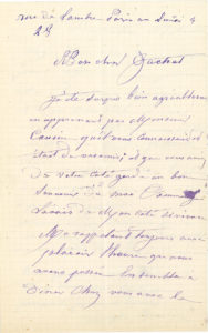 • Lundi 28 [octobre]. «J'ai été surpris bien agréablement en apprenant par Monsieur Causin qu'il vous connaissait et était de vos amis ; et que vous aviez de votre côté gardé un bon souvenir de moi comme je l'avais de mon côté si vivace. Me rappelant toujours avec plaisir l'heure que nous avons passée ensemble à dîner chez vous avec le regretté Bataille. Soyez donc assez bon je vous prie pour m'écrire un petit mot dans lequel vous me donnerez et de vos nouvelles et une idée du pays que vous habitez. [...] J'espère avoir le plaisir de vous voir dans un de vos voyages à Paris, et peut-être que j'irai vous voir si je savais un jour où vous seriez libre, quelle bonne bouffée du bon vent d'autrefois je respirerais. Ma poignée de main digne des temps homériques»...