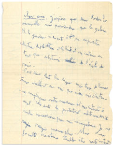 L.A.S. "Gaston Chaissac" with DRAWING, Vix (Vendée) [ca. 1962, to René MENDÈS-FRANCE] ; 2 pages small-in-4 in blue ballpoint pen on squared schoolbook paper (one edge unevenly cut). — Beautiful letter illustrated with a drawing. "I hope that without delay the news will reach you that the gallery H. Legendre is inviting me to its group show on the theme of the box and its contents as a selected member of the Paris school. It is undoubtedly a good sign but too many good souls are growing old on me that my life is overly complicated and my interests hurt. A sort of arbitrary protectorate would be made necessary by my incompetence. I don't even react anymore. But my creative faculty seems to have remained intact. I am thinking of experimenting with my shepherd's limousine as a fetish and I have changed my style. Logic can lead to evil as well as fashion"... — The drawing at the end of the letter, occupying the lower half of the page (about 13.5 x 15 cm) represents a man with his arms raised who seems to be flying away.