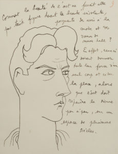 The Mystery of Jean l'Oiseleur. Self-Portrait No. 9. [1924]. — Original Indian ink drawing, numbered in red pencil, with autograph MANUSCRIT. 25 x 19.4 cm on view (framed). — In the margin of his self-portrait, Cocteau wrote this comment : "How could the beauty of art not look sad in front of the insolent, poignant beauty of fashionable notices and music hall dances? For these must give all their force at once and give way, while art must spread its own gradually, over a space of many centuries." — The project of the Mystery of John the Baptist was born in October 1924 in Villefranche-sur-mer. In his room at the Hôtel Welcome, Cocteau "has no one to talk to but himself. From the table in front of which he sits, he sees himself in the mirror of his wardrobe [...] The 31 self-portraits to which he adds a few sentences or snippets of text are among his treasures. The 31 self-portraits to which he adds a few sentences or snippets of text are among his treasures. The surety and simplicity of the line, the acuity of the detail, the relevance and sincerity of the subject [...] By mixing writing and drawing, which is "a writing unraveled and rewoven in a different way", Cocteau offers the publisher Édouard Champion one of his most beautiful poetic works : Le Mystère de Jean l'Oiseleur. [...] The title intrigues. A bird-catcher catches birds with a net. Does Cocteau capture the thoughts that come to his mind to squeeze them into a page? (Dominique Marny). — These 31 self-portraits by Jean Cocteau are "plunging views into his soul" (Pierre Bergé). Le Mystère de Jean l'Oiseleur will be published in 1925 by Édouard Champion in the form of a phototype of the manuscript made by Daniel Jacomet and printed in 142 copies. — Reproduced in the Album Cocteau (Pléiade, p. 159) ; Dominique Marny, Jean Cocteau, archéologue de sa nuit (Textuel, 2010, pp. 72-77). — EXHIBITIONS Jean Cocteau, Staatliche Kunsthalle, Baden-Baden, 1989, no. 232 ; Jean Cocteau, Musée d'Ixelles, Brussels, 1991 ; Jean Cocteau, Centre Pompidou, Paris, 2003-2004 ; Jean Cocteau, sur les pas d'un magicien, Palais Lumière, Évian, 2010. — PROVENANCE Collection Liliane et Étienne de Saint-Georges, Brussels ; Sotheby's Paris sale, 24 November 2010, no. 197.