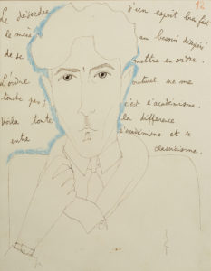 Autour de son autoportrait, de face, Cocteau a inscrit ce commentaire : «Le désordre d'un esprit bien fait le mène au besoin désespéré de se mettre en ordre. L'ordre naturel ne me touche pas ; c'est l'académisme. Voilà toute la différence entre l'académisme et le classicisme».