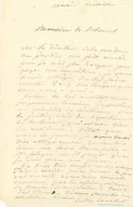 L.A.S. "Gustave Courbet", Versailles Tuesday [mid-September 1871], to a colonel [Louis-Dieudonné Gaillard?] ; 1 page in-8. — Letter from prison, after his indictment for the destruction of the Vendome column. [Courbet was transferred from the Orangerie to the Versailles House of Justice, before being taken to Sainte-Pélagie]. "Mr. Director of the House of Justice warns me that I have no more money to pay for my food, I would be obliged to you to make him give me 50 f. out of the money you have for me. According to the law, as soon as my judgment is over, I belong to the Minister of the Interior and to the civil justice of the department of the Seine, which is my place of residence. As soon as you can, I will be very obliged to you again to kindly have me transported to St. Pelagie, where it seems that I must serve my prison term. I am very unwell and lacking in air - then to save what little I have left of my complete ruin caused by the political affairs of France, and my deprivation of work"... — Correspondence, n° 71-39 (p. 391).