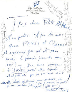 Nous partons à la fin du mois pour Paris et l'Espagne et espérons que cet été nous aurons la grande joia de vois voir ! - Nous devons arranger les “taxes” [le mot en entouré de quatre flèches] avant notre départ et cet pour cela que je vous envoie la “note”»... Il termine : «Vive le Prince des gouts Felows !»... Au dessus de l'entête, il a dessiné à l'encre une fourmi... GALA a écrit dans les marges quelques lignes en anglais adressées à «Dear Jack», lui recommandant d'embrasser Annouchka...