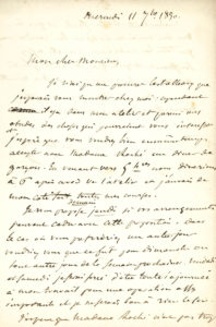 •11 septembre 1850, [à l'architecte bordelais Alexis ROCHÉ]. «Je n'ai pu me procurer les tableaux que j'espérais vous montrer chez moi : cependant il y a dans mon atelier et parmi mes études des choses qui pourraient vous intéresser et j'espère que vous voudrez bien en même temps accepter avec Madame Roché un dîner de garçon. En venant vers 5 hres nous dînerions à 6 après avoir vu l'atelier»...