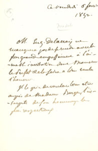 •6 février 1852, [à Jean-Jacques BERGER]. «M. Eug. Delacroix ne manquera pas de prendre avec le plus grand empressement à l'aimable invitation dont Monsieur le Préfet de la Seine a bien voulu l'honorer»...