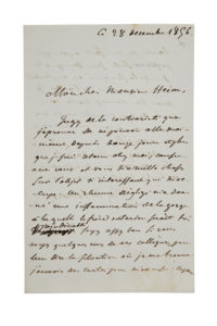 L.A.S. "Eug. Delacroix", December 28, 1856, to François HEIM ; 1 page and a half in8. — At the time of his candidacy to the Institute (he will be elected on January 10). — He is very upset not to be able to go and see Heim to discuss "the very interesting subject that occupies me", detained at home for the last twelve days by a "neglected cold" which has worsened into "inflammation of the throat". He asks him to explain his situation to their colleagues, and sends them apology cards. He hopes to be able to go out again soon : "I shall be very happy to go and tell you of my fears and hopes, to you who have welcomed me so well"...