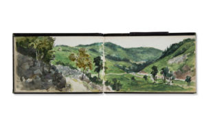[F. 2]. Aquarelle, débordant sur la page de gauche, datée «19 août Plombières» : paysage (collines couvertes de forêts). En haut de la page de gauche, note au crayon : «aller voir Lamy».