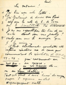Il a reçu la lettre d'Einstein et y répond en 8 points numérotés... «J'ai justement des dessins sur Paris». Il évoque les notes de Guillermo de TORRE (1900-1971, essayiste et poète espagnol, que le couple Delaunay avait fréquenté lors de leur séjour à Madrid en 1917-1921) «sur le simultané. Très intéressant». Il aimerait réviser ces notes : «Il faut absolument combattre cette infâme réaction de ceux qui commencèrent la révolution de 1910-11-12-13-14 -qui reviennent au néo-grec - au rococo - au néo Barocco etc - ou au faux chaldéen. Tout cela faute d'avoir trouvé des moyens propre à exprimer un état organiquement viable. Il y a actuellement dans les esprits un esprit de décadence, de pourriture et de décomposition. Il faut dans tous les pays des enquêtes. Une révision des choses ? Bilan des générations».