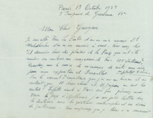 «Vous avez les 21 dernières séries des plaisirs de la Paix qui ont été remises en rouleau au magasinier de Crès Mr Bertrand. Rendez-moi le service de m'envoyer de suite une série ou plutôt 3 séries pour mon exposition de Bruxelles [à la galerie Le Centaure]. Sur le carnet d'inventaire que j'ai vu au bureau il ne restait que 10 séries chine et 11 Japon, où sont les autres ? Laffitte vient à Paris sous peu, prévenez-moi.