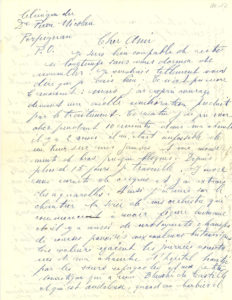 Il est hospitalisé à la clinique du Dr Nicolau, et son traitement apporte une réelle amélioration : «ce matin j'ai pu marcher pendant 10 minutes [...] il y a 2 mois il m'était impossible de me tenir sur mes jambes et sans mouvements de bras, presque bloqués. Depuis plus de 15 jours je travaille. J'ouvre mes carnets de croquis et j'ai extrait des aquarelles. Ainsi j'ai mis sur le chantier la série de mes orchestres qui commence à avoir figure humaine et il y a aussi de verdoyants champs de courses pavoisés aux couleurs britanniques, les couleurs égaient les journées monotones de ma chambre d'hôpital hantée par les soeurs espagnoles». La domestique est andalouse, le barbier catalan, qui le rase en lui récitant le Don Quichotte de Cervantès, et les grands poètes espagnols : «cette ambiance est surprenante». Le Dr NICOLAU et son entourage sont pour lui des anges. Il espère s'améliorer pour reprendre un jour une vie normale et «continuer mes travaux en projet avec les médiums maroger». Il n'écrit pas et n'a de nouvelles de personne : «Je sais que DERAIN va travailler à Aubusson à des tapisseries, j'en ai une à faire mais je suis incapable de m'y mettre à présent je n'ai qu'une petite maquette de faite». Il a bien reçu «votre magnifique plaquette de coquillages [Les Merveilles de la Mer. Les Coquillages], le texte de VALÉRY m'a ébloui. Quant aux coquillages vous savez comme je les aime même en aquarelles»...