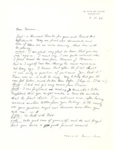 L.A.S. "Max Ernst", Paris 6 October 1966, to Varian FRY ; 1 page in-4 at address 19, rue de Lille ; in English. — To the founder of the American Relief Committee in Marseille. [Varian FRY (1907-1967), American journalist, founded the American Relief Committee in Marseilles in 1940, which helped thousands of refugees, Jews, anti-Nazis, and Surrealists, including Max Ernst, to leave Europe]. — The letter is numbered in six points (from first to sixth), probably in response to a request or questionnaire from Varian Fry. — First, a thousand thanks to Varian and Bénéditte [Daniel Bénédite (1912-1990), a Resistance fighter who assisted and succeeded Varian Fry, and lived at the Villa Air-Bel with the refugee Surrealists in Marseille] for their "affidavits [attestations]. They are first class documents"... Secondly, he is happy to learn of his recovery ; from experience, he knows that it is above all a question of patience : "as I myself have been through the same experience not long ago, I knew, that after the first shock itw as only a question of patience". He'll get better and better... Thirdly, he did not receive an answer from Picasso. Fourthly, he was afraid, reading Annette's letter, that Varian would make a terrible mistake, at the first shock. He is relieved since the letter received today. M.Th. was certainly his "gardan angel"... Fifthly, to hell with Otto DIX ("to hell with Dix"). Sixth, that he take good care of himself and do not forget that you have a good friend named Max Ernst.