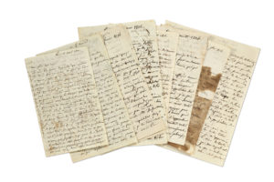 8 L.A.S. "Girodet" or "Girodet-Trioson" (one unsigned), Paris [1795 ?]-1814, to Doctor Benoît-François TRIOSON, at his land of Bourgoin near Montargis ; 22 pages in-8, mostly with address (heavy spotting and foxing to the last). — Interesting correspondence to his friend, then adoptive father, notably on the upheavals after the fall of the Empire. [Late July 1795?] His requests for a workshop and the repairs to be done in his house take a lot of time, but "the change in the ministry of the interior makes me hope that I will succeed. [...] As for the matters of interest that concern me personally, I only needed to swallow this chalice on top of the one of seeing my state lost without resources. I am only astonished that you propose this occupation as a distraction"... However "artists are made to pay dearly in many ways for the honour of living in the Louvre"... He will send him his varnished painting on the 13th thermidor... August 8th [1808]. Vivant DENON predicts him a complete success. "However I do not have yet the precise idea of what will be my painting, there is still too much to do for one month of work which remains to me. I have been much slower than I would have liked because I had to go in search of a thousand details of costumes, of which I was finally able to obtain several, and which put enough truth in my painting. The group of the generals is almost finished and makes a rather happy effect"... April 12, 1810. On the affairs of his "father" and friend : his location in Paris, acquaintances or friends, a debt to M. Desaugiers. "I have sketched the portrait of Made Rilliet who is doing quite well"... February 16, 1814. "Here [...] everything is in motion and in the worried expectation of the greatest events. One expects to see the enemies tomorrow or Sunday. [...] Everyone is hiding his most precious effects or sending them outside as secretly as possible. I am busy at the moment packing up all the portraits of the Emperor that I have at home. I do not know what I will do with them, the Minister of Justice having told me that there was no room at his hotel, I have already spent three nights packing my studies. Mr. Denon is no busier than I am at the Museum, which is moving fast. I cannot get a penny from the Minister of the Treasury"... March 30th. The enemy is in the forest of Bondy and at Pantin ; he hears the cannonades from this skate and the National Guard is on all sides. "Almost all the shops are closed, and there are hardly any that are edible, from which one sees only troops and artillery passing by ; the boulevards are full of groups of people who are wondering and making their conjectures. Here we are at the moment of a great catastrophe"... July 13th. He is going to deal with Trioson's letter to Monsieur ; M. de Malateste has recommended that he entrust his petition to His Royal Highness to the Count d'Escars, Captain of Monsieur's Guards... "I have received notice from the Minister of the Interior that I am to be paid my housing allowance as usual. [...] This makes me hope that my great claim on the government will not be completely lost. At this moment I cannot yet claim. I will also go see Mr. de St. Vincent. My competitor is well anchored and well protected"... He is going to try to make paintings that will please "our neighbors the islanders", from whom he receives visits... August 4th. He went to Saint-Cloud, where he put his father's petition into the hands of Monsieur. "I was going to make at least one sentence, but the prince walked quickly and found himself on the spot beset with other importunities." He asked for an audience with the Duke de Mailly, "premier Gentilhomme de la Chambre de Monsieur."... 17 November. He suffers from "an eye ache so strong that it is only through a cloud that I write to you. But it does not prevent me from directing my pupils who are working in front of me and for the paintings in Compiègne. [...] It is a happiness for me in the midst of my distress that this enterprise that I will carry out well and which must hold me for more than eighteen months"...
