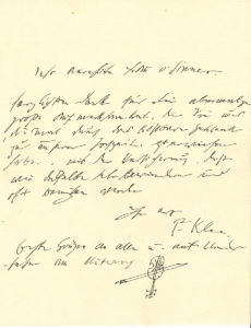 L.A.S. "P. Klee" with DRAWING, [September 1906], to Marie von SINNER-BORCHARDT (1867-1955) ; 1 page small in-4 ; in German. — He thanks her for the new and great attention she has shown him with the precious wedding gift ; Klee and his wife admire it very much and will use it often : "herzlichsten Dank für die abermalige große Aufmerksamkeit, die Sie uns diesmal durch der kostbare Geschenk zu unserer Hochzeit erwiesen haben, mit der Versicherung, daß wie daßelbe sehr bewundern und oft benutzen werden"... They will meet again on Wednesday. Drawing of a violin with its bow. [Klee married his wife Lily on 15 September 1906 ; the previous year he had painted a portrait of Marie von SINNER (1867-1955) in Bern-Engried ; she was among the first collectors of Klee's works ; she owned a Guarneri violin, which she lent to musicians for concerts].