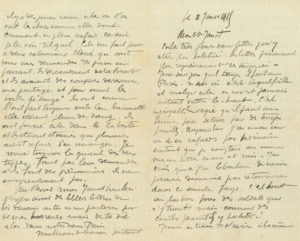 L.A., January 11, 1915, to Jeanne LOHY ; 4 pages in-8, envelope to "Madame Léger". — Beautiful and moving letter from the front in Argonne, to his wartime godmother and future wife. [Jeanne LOHY (1895-1950), met before the war in artistic circles, was the wartime godmother of Fernand Léger, who officially married her in 1919. The letter is addressed to "Madame Léger" at "Serge Jabstrebzoff", the painter Serge Férat]. "My dear Janot, here are three days without letters I was no longer used to them. [...] I don't know what the weather is like in Paris, but here it's unbearable, and in spite of that we've never fought so hard up there. It's incredible the energy it takes for men to kill themselves in such weather. Today I've got another one of those unusual cockroaches, especially as I was counting on at least one letter this evening and nothing. I think that if I am fortunate enough to return I will never in my life go back to that sinister country. It is at most good for soldiers who kill themselves there. But how can civilians live there? [...] I can still hear that damn machine gun, which insists on being heard every time I write to you. We have to attack hard on the side of the 2nd Corps. All day a formidable cannonade, and then when we push hard, it is the infantry and the machine guns. [...] To think that at the minute I am writing to you there are men who, in the freezing rain that is falling in gusts, in mud up to their knees, are throwing themselves at each other with bayonets. Think, Janot, of what they would be doing if they were not at war [...] Think of all those poor fellows who are dying slowly in the knowledge that they are going to die there without any help. The day before yesterday a whole platoon of my company was enveloped. We are left with 4 of the squad out of 15. What happened to them? We'll never know. We know from some who were able to save themselves that they held out almost to the end. When they ran out of ammunition they took pickaxes and crowbars, they fought like savages after spending 16 days up there with one meal a day. When you learn after that that there are premieres at the Moulin-Rouge, it breaks your legs. It's terrible to think that Paris is laughing and that so many poor devils are being beaten up. I realise, my Janot, that I am writing you a sinister letter. There are days like that when one sees things as they are, and tonight I see them as they are. He tells of the passage of two wounded colonials with whom he shared canned goods, "and to open the cans of 'monkey' they did as they always do, pull out their bayonets and they were full of blood. They stuffed it in the can and they were surprised that many refused to eat it. [...] Goodbye my dearest Janot. I hope to get some nice letters from you tomorrow where you won't tell me about my horrors but about your own life in our old Paris. A million kisses everywhere."