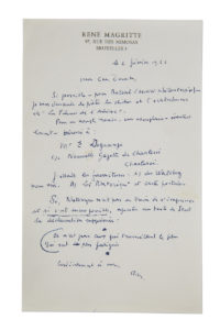 L.A.S. "RM", Brussels February 2, 1966, to the publisher André DE RACHE ; 1 page in-8 on his letterhead. — The handwriting is shaky and tired : Magritte will die 18 months later of cancer at the age of 69. The letter is about Magritte's work for the magazine Rhétorique and a text by Louis SCUTENAIRE : "If possible - for Beloeil (philanthropic work) - I ask you to lend the pictures and the echtachrome of Les Fleurs de l'Abîme". He asks to send a copy for review to E. Degrange of the Nouvelle Gazette de Charleroi. "I am waiting for the supplies : A) Waldbergs for me. B) The Rhetoric and postcards. If, Rhetoric is not going to print and if it is still possible, add to Scut's text the deleted statement : "it is not those who work the most who are the most tired"...