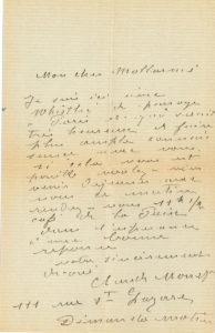 2 L.A.S. "Claude Monet", [Paris May 1888], to Stéphane MALLARMÉ ; 1 page in-8 and envelope (small crack in fold repaired), and 1 page in-12 with address on reverse (telegram). — Mallarmé's meeting with Whistler. [Monet was well acquainted with WHISTLER, with whom he participated in several exhibitions, notably in 1887, and with whom he spent a few days in London in May 1888. Mallarmé met Whistler through Monet in early 1888, and a lasting friendship was then formed between them]. — Sunday morning. "My dear Mallarmé I am here with Whistler, who is passing through Paris and who would be very happy to make more acquaintance with you. If it is possible, would you like to come and have breakfast with us this morning [...] café de la Paix"... He gives his address "111 rue St Lazare". — Sunday [May 26]. "My dear friend What a disappointment for me yesterday not to be able to join you and Whistler. Arrived this morning Whistler tells me that I will please you by coming to dine with him this evening, but am I not being indiscreet"... He gives his address "111 rue St Lazare Hôtel Garnier"...