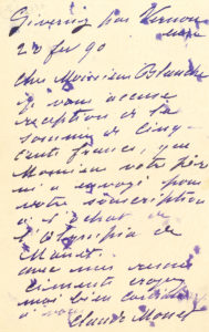 L.A.S. "Claude Monet", Giverny 20 February 1890, to Jacques-Émile BLANCHE ; 1 page in-8 in violet ink. — Subscription for the purchase of Manet's Olympia, to be offered to the Louvre museum. [The young painter Jacques-Émile BLANCHE (1861-1942) was one of the subscribers ; we see here that it was his father, the famous alienist doctor, who paid]. "I acknowledge receipt of the sum of five hundred francs, which Monsieur your father has sent me for your subscription to the purchase of Manet's Olympia...