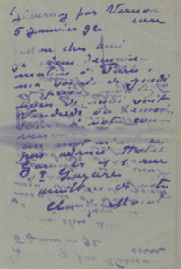 •11 mai. «Je ne veux pas vous laisser plus longtemps sous la mauvaise impression de notre dernière conversation. Je me soumets en songeant au plaisir de vous avoir une journée à Giverny, car vous savez qu'il n'est pas possible de venir ici autrement que par le train de 8 h. du matin, et que le frugal déjeuner du peintre est de rigueur. Mais que ces Messieurs ne s'attendent pas à trouver un grand choix de tableaux chez moi, le nombre de choses possibles pour un musée est très restreint»...