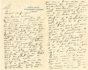 L.A.S. "your old Claude", London 12 February 1900, to HIS WIFE ALICE ; 4 pages in-8 on the letterhead of the Savoy Hotel. — Nice letter about his work in London for the Thames views. ... "you think I will use the time to bring back good things if possible. I started work yesterday and today a little more but the weather is terribly variable. It's so foggy that I can't see anything at times. I had to go out again today to see the director of the hospital who received me well and gave me a permit to paint wherever I wanted and I would have started this evening if it were not for the thickness of the fog. I would have started tonight if it were not for the thickness of the fog. Finally, I had an easel and some of the things I need sent to the hospital. [...] I don't have a room as such but a huge reception room where I will leave my things, because I will have to paint in the open air, or at least on a covered terrace. [...] I am doing very well and as I have had a lot of time to get out and about I am sleeping wonderfully. There have been 14 degrees here and a lot of snow, but fortunately it is melting. It is going to be the thaw, hence this terrible fog, and I think I will have to be on the lookout for the effects often. Let's go, my good old friend, see you tomorrow, I kiss you as I love you"...