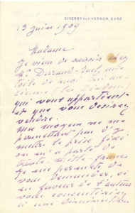 L.A.S. "Claude Monet", Giverny 13 June 1909, [to Winnaretta SINGER, Princess of POLIGNAC] ; 1 1/2 pages in violet ink on paper with her engraved address (3 tiny stains). — On his painting The Turkeys, which he would like to buy back. — He has just seen again at DURAND-RUEL's "a very old painting of mine (The Turkeys) which belongs to you and which you wish to sell. — As my means do not allow me to put the fixed price on it, I take the liberty of asking you, if in favour of the author, you would agree to a reduction. You will please excuse the liberty of my request"... [This is the large painting The Turkeys [W416, Musée d'Orsay], painted in 1877 by Ernest Hoschedé, who was its first owner ; it then passed successively to Giuseppe de Nittis, Théodore Duret, then François Depeaux, before being acquired in 1906, at the Depeaux sale, by the Princess of Polignac. — The latter replied to Monet on 25 June 1909 that she was only reluctantly parting with his painting "because I had not been able to find a place at home worthy of such a beautiful work" ; but she had just "bought a house in London of which the Turkeys will be the most beautiful ornament". She therefore regrets not being able to respond favourably to his request... (Claude Monet Archives sale, 13 December 2006, no. 229)].