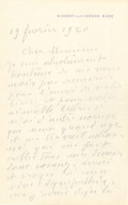 L.A.S. "Claude Monet", Giverny 19 February 1920, [to Emmanuel BOURCIER] ; 2 1/2 pages in-8 addressed to him, in pencil. — While working on his Water Lilies. — He is ashamed not to have thanked him earlier for sending his book : "I have no other excuse than my old age and hard work, which makes me forget all my duties [...] believe in my deepest sympathy, for I had already read your book, Gens de mer, and for which I am happy to congratulate you. He would be happy to have his visit, but in "3 or 4 weeks, being in the grip of a considerable work which absorbs all my time"... [Emmanuel BOURCIER (1880-1955), journalist and novelist, had published his novel Les Gens de mer in 1919].